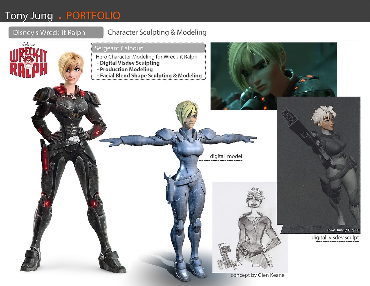 De acuerdo con Rich Moore (director de la cinta), Calhoun fue planeada originalmente para ser personaje masculino, sin embargo, él pensó que la idea de un sargento hombre de videojuegos de disparos era un recurso sobreexplotado. Posteriormente se propuso la idea de que fuese el interés amoroso de Félix. En algunos diseños aparece con largo cabello negro y en otros con un peinado similar al que tiene en la película pero mucho más ondulado y despeinado. Su modelo 3D fue hecho y esculpido por el artista Tony Jung.